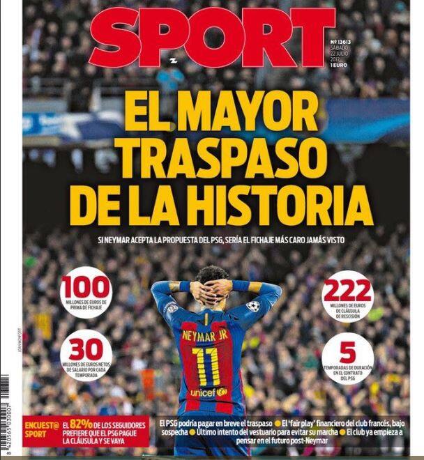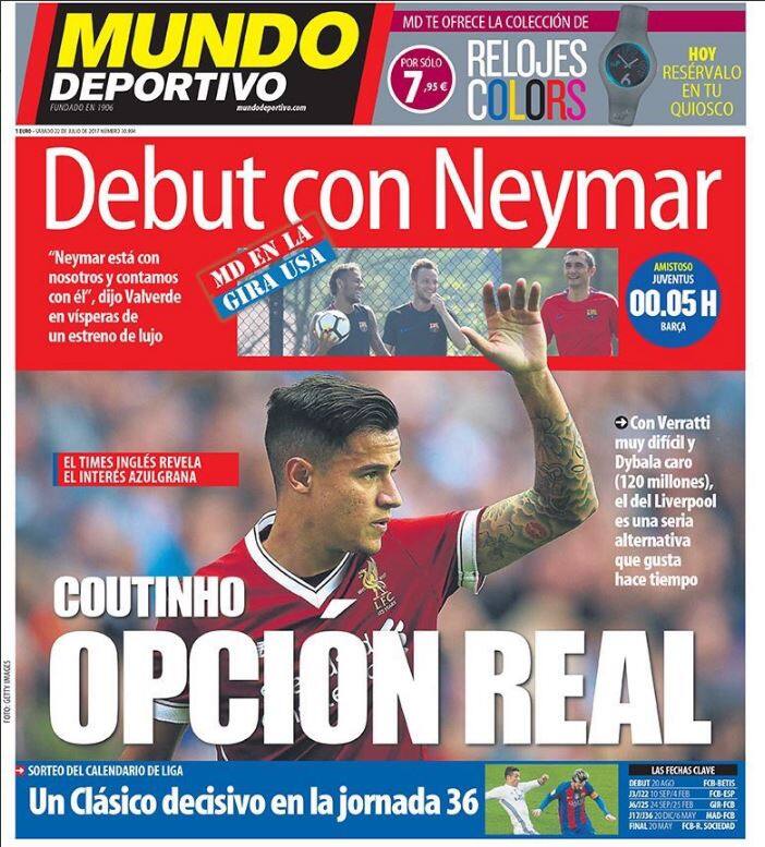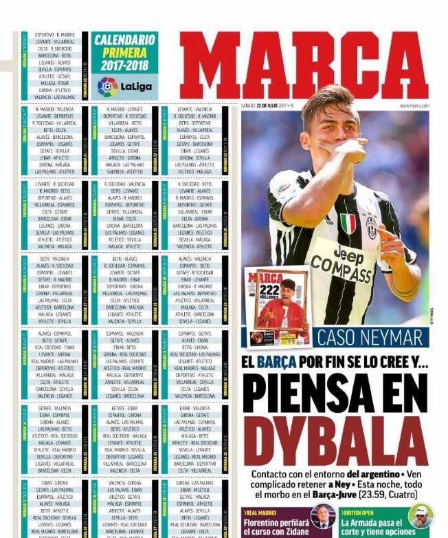 Il Barcellona è pronto a completare con il PSG l’operazione più onerosa della storia del calcio. Neymar sembra infatti deciso a passare al club francese, che pagherebbe la clausola da più di 200 milioni di euro. A dare i numeri è oggi Sport, che scrive così: “Il più grande affare della storia. 222 milioni di clausola, 30 milioni netti a stagione per il brasiliano e 5 anni di contratto”. E la società blaugrana già si cautela, mettendo gli occhi su Paulo Dybala, gioiello della Juventus: “Il Barça pensa a Dybala - titola Marca - contatti avviati per l’argentino, visto le complicazioni legate alla permanenza di Neymar. E questa notte c’è Barcellona-Juventus”. Sull’altra sponda, quella madrilena, il Real pensa invece a un altro rinforzo in attacco. Dybala costa troppo, la trattativa per Verratti è in salita, ecco che i Blancos stanno puntando Philippe Coutinho del Liverpool, che secondo il Mundo Deportivo piace da tempo alla dirigenza.
