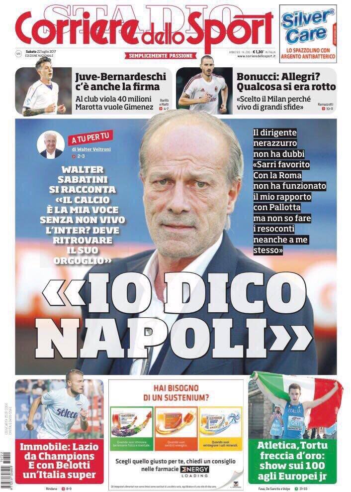 L’Inter ha disputato nella giornata di venerdì la sua seconda amichevole stagionale, questa volta contro lo Schalke 04, terminata 1-1. Qualche nota positiva per Spalletti (super il gol di Murillo), che ora aspetta nuovi rinforzi sul mercato. “L’Inter cresce, Keita aspetta” scrive in questo proposito La Gazzetta dello Sport: “Spalletti tra tournée e mercato. Lotito: ‘Nessuna offerta per il giocatore’”. Per il mercato nerazzurro c’è anche Lucas Lima, centrocampista del Santos in scadenza a dicembre che la dirigenza sta cercando di portare subito in Italia: “Inter su Lucas Lima, un jolly per Spalletti” scrive il Corriere dello Sport. Si muove anche la Roma, che ha ormai definito l’arrivo di Aleksandar Kolarov dal Manchester City: “Roma, ecco Kolarov. E il rinnovo di Nainggolan è ormai cosa fatta” titola in taglio basso La Gazzetta dello Sport. Tuttosport rilancia: “Roma, Kolarov in arrivo”.