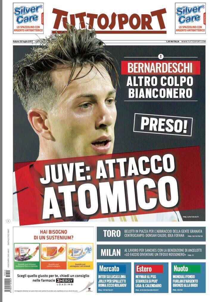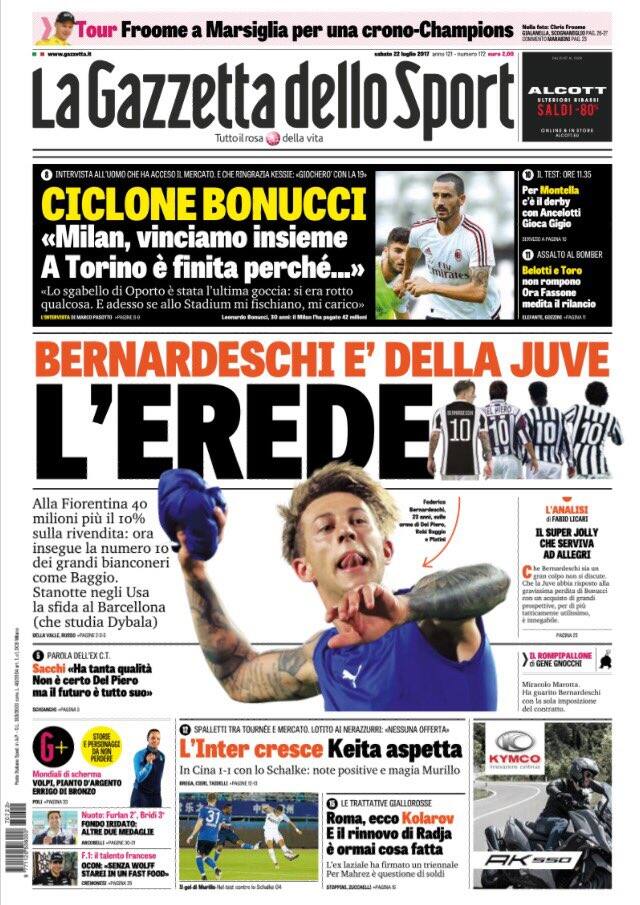 Juventus, finalmente Bernardeschi. Dopo un corteggiamento durato diverse settimane, i bianconeri sono pronti ad accogliere il numero 10 della Fiorentina. Sarà il fantasista viola il terzo colpo della campagna acquisti estiva, dopo Douglas Costa e De Sciglio: quella per Bernardeschi sarà (per ora) anche l’operazione più onerosa conclusa da un’Italiana durante la finestra di mercato in corso. “Bernardeschi è della Juve, ecco l'erede" scrive La Gazzetta dello Sport in prima pagina: “Alla Fiorentina 40 milioni più il 10% su una futura rivendita del giocatore: ora insegue la 10 dei grandi bianconeri come Baggio e Del Piero”. E “stanotte negli USA i bianconeri sfidano il Barcellona (che studia Dybala)”. Anche su Tuttosport si parla, ovviamente, di Juventus: “Attacco atomico” titola il quotidiano torinese: “Preso Bernardeschi! Altro colpo bianconero”. Il Corriere dello Sport: “Juve-Berna, c’è anche la firma. Ai viola 40 milioni, Marotta vuole Gimenez dell’Atletico Madrid”.