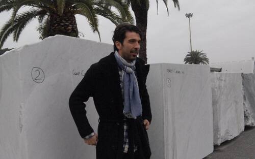 Una foto molto simbolica: Buffon posa davanti a dei grossi pezzi di marmo estratti dalle montagne di Carrara -