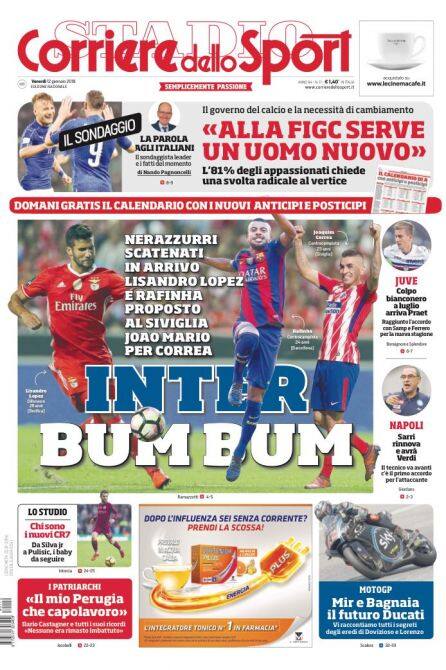 Calciomercato protagonista nelle prime pagine dei quotidiani sportivi italiani in edicola. La scena se la prende l'Inter, che nella giornata di ieri ha messo a segno il colpo a sorpresa per accontentare la richiesta di Spalletti per la difesa: dal Benfica è infatti arrivato Lisandro Lopez. "Inter, un colpetto. Lisandro Lopez ok, ora Rafinha. Blitz a Lisbona per il difensore del Benfica: prestito. Vicino anche il blaugrana", scrive la Gazzetta dello Sport, che però dedica il titolo principale al futuro di Mauro Icardi: "No Champions, no Icardi" - scrive il quotidiano: "Il piazzamento in campionato e i possibili nuovi introiti sono cruciali per il futuro del capitano, che ambisce ad un ingaggio da top player a 9 milioni a stagione". Per quanto riguarda il Napoli, "De Laurentiis ha fretta e vede Sarri per il rinnovo" - si legge. Per il Milan è "tour tedesco": nel taccuino di Mirabelli ci sarebbero Brandt e Weigl. Mentre la Juve ha ormai prenotato Emre Can.