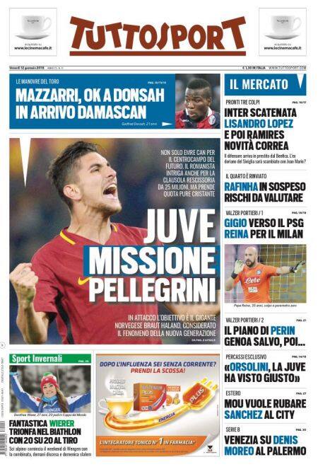 Nerazzurri in prima pagina anche sul Corriere dello Sport, che titola "Bum bum Inter". "Nerazzurri scatenati, in arrivo Lisandro Lopez e Rafinha", il quotidiano parla anche di un possibile scambio Joao Mario-Correa proposto al Siviglia. Per la Juve invece si prospetta un arrivo, sempre a centrocampo: "Colpo bianconero, a luglio arriva Praet. Raggiunto l'accordo con la Samp e Ferrero per la prossima stagione". Fronte Napoli, "Sarri rinnova e avrà Verdi". In taglio alto si esula per un attimo dal tema mercato: viene proposto un sondaggio agli italiani appassionati di calcio e per l'81% di loro c'è la necessità di un cambiamento: "Alla FIGC serve un uomo nuovo". Su Tuttosport, Juventus in prima pagina: "Missione Pellegrini", scrive il quotidiano torinese, che spiega: "Non solo Emre Can per il centrocampo del futuro. Il romanista intriga anche per la clausola rescissoria di 25 milioni. Ma prende quota anche Cristante". Si parla anche di un possibile rinforzo in attacco: "Il gigante norvegese Braut Haland, considerato il fenomeno della nuova generazione". In taglio alto spazio al mercato del Torino: "Mazzarri, ok a Donsah. In arrivo Damascan". Poi tutto il mercato della Serie A, con l'"Inter scatenata" e il valzer dei portieri che coinvolgerebbe anche Reina e Donnarumma: il portiere rossonero sarebbe diretto in Francia verso il Paris Saint-Germain, con il n.1 azzurro che finirebbe invece al Milan. Vicenda Sanchez: "Mou vuole rubare Sanchez al City".