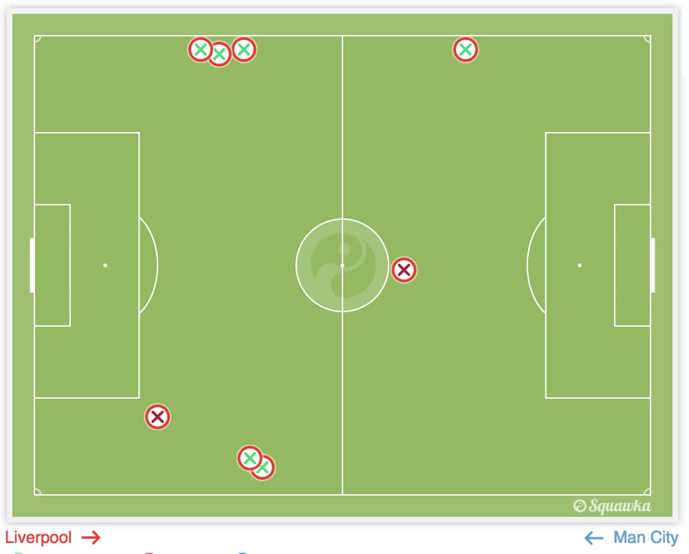 Emre Can però è stato anche uno dei giocatori ad aver eseguito più tackle in partita (8) e quello con la percentuale di riuscita più alta (75%). Se si guarda alla mappa dei suoi interventi difensivi (qui sotto), si nota subito come abbia distribuito i propri interventi su entrambe le fasce, compiendone solo uno al centro, dove probabilmente ha avuto maggiore importanza la sua capacità di schermare le linee di passaggio verso le ali del City.