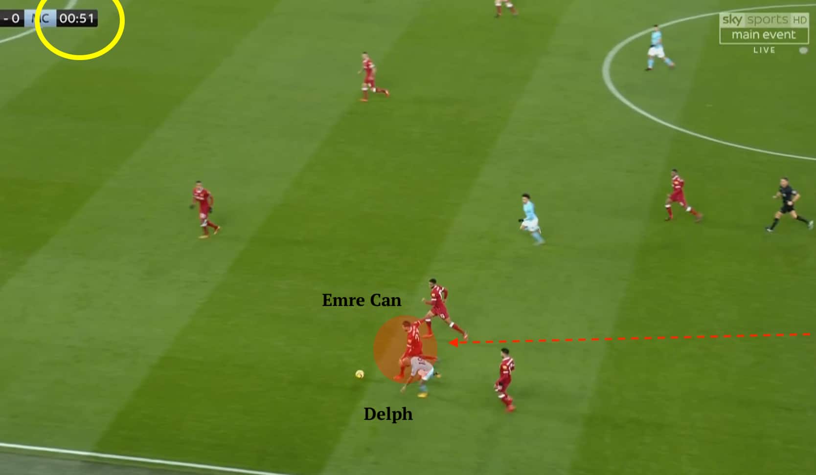 Erme Can aveva risolto una situazione molto simile nei primi secondi di gioco, stavolta usando il proprio peso e la propria forza per spostare Delph, che si era infilato alle spalle di Chamberlain, in maniera pulita. A inizio azione sta portando pressione sul playmaker avversario e la palla arriva a Gündogan proprio dopo che Emre Can ha intercettato un passaggio di Fernandinho diretto a Leroy Sané: il rimpallo favorisce la sovrapposizione di Delph e a Emre Can non resta che corrergli dietro per venti metri e strappargli la palla dai piedi.