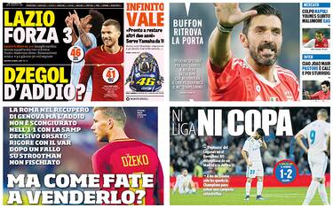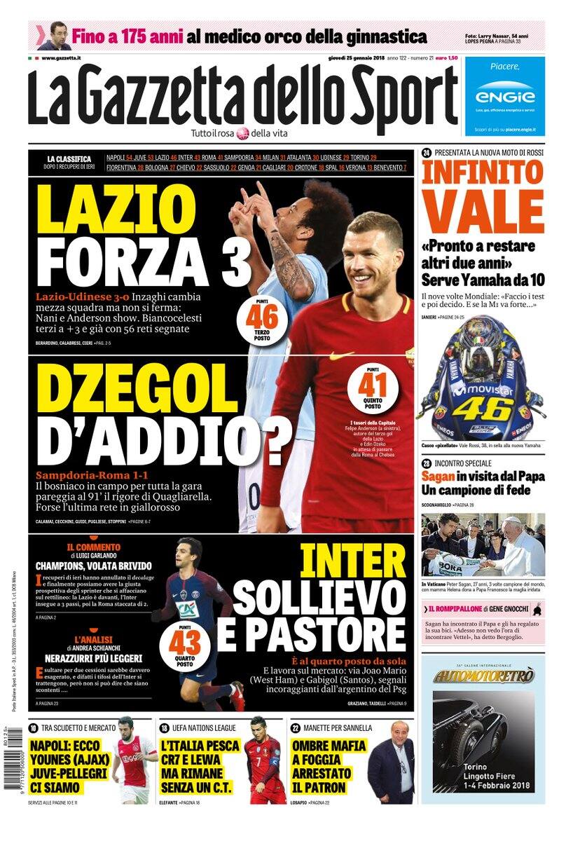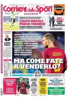 Lazio, Roma e Inter si prendono l'apertura della Gazzetta dello Sport, che suddivide in tre la prima pagina di oggi. In alto i biancocelesti esultano per il tris rifilato all'Udinese che vale il terzo posto in classifica. Inzaghi cambia mezza squadra ma non si ferma, godendosi i gol di Nani e Felipe Anderson. Al centro, spazio al possibile ultimo gol di Dzeko in maglia giallorossa, il bosniaco pareggia nel recupero il gol di Quagliarella, salvando la Roma al Ferraris. In basso, spazio all'Inter e al suo assalto a Pastore. I nerazzurri salutano Joao Mario (e Gabigol), ricevendo segnali incoraggianti dall'argentino. Dzeko campeggia in prima pagina anche sul Corriere dello Sport: 'Ma come fate a venderlo?' la domanda ricorrente dopo la rete segnata alla Samp. Se la Roma si interroga, il Napoli affonda il colpo Younes, raggiungendo l'accordo con l'Ajax per quattro milioni più uno di bonus. In basso, spazio al 'Paradiso Lazio', mentre Bonaventura afferma: "Con Gattuso è un altro Milan". 'C'è posto per te' è l'apertura di Tuttosport, che riaccoglie Gigi Buffon dopo l'infortunio. Il portiere bianconero torna in campo dopo lo stop forzato, festeggiando al meglio i suoi 40 anni. In basso spazio al mercato del Toro, con Ljajic che si gioca la sua permanenza in granata. In spalla, infine, si parla di mercato con il Napoli che mette le mani su Younes e l'Inter che saluta Joao Mario e ci prova per Pastore e Sturridge.