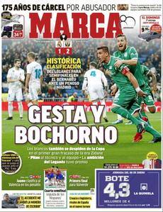 Sui quotidiani spagnoli riecheggia la sconfitta clamorosa del Real Madrid in Copa del Rey, eliminato dal Leganes dopo il ko subito al Bernabeu. Il nome del Leganes rimbomberà per tutto il mondo, la frase ad effetto di AS, che riporta poi le parole di Zidane: "Per me è un chiarissimo fallimento". In alto, invece, sorride il Valencia che vola in semifinale battendo l'Alaves ai rigori. Ancora più duro il commento di Marca, che sottolinea la prova penosa del Real Madrid. Un fallimento bello e buono quello dei blancos, costretti ad incassare la prima vera debacle dell'era Zidane. 'Senza Liga e senza Coppa' l'apertura del Mundo Deportivo, che si sofferma sul clamoroso ko del Madrid al Bernabeu. Adesso all'allenatore francese resta solo la Champions per salvare un'annata catastrofica. In alto, non poteva mancare il riferimento al Barcellona, che scenderà questa sera in campo contro l'Espanyol. Valverde si affida anche ai nuovi arrivati Coutinho e Yerri Mina per rimontare gli avversari, inserendoli nella lista dei convocati. In basso, infine, si menziona la qualificazione del Valencia, giunto fino ai rigori per avere ragione dell'Alaves e strappare il pass per il turno successivo della Coppa del Re. 'Una fame da Lione' è il titolo che campeggia in prima pagina sull'Equipe, che esalta la vittoria in trasferta ottenuta a Monaco in Coppa di Francia. In alto infine, spazio al Psg, con Cavani che resta in attesa del record di gol da strappare a Ibrahimovic.