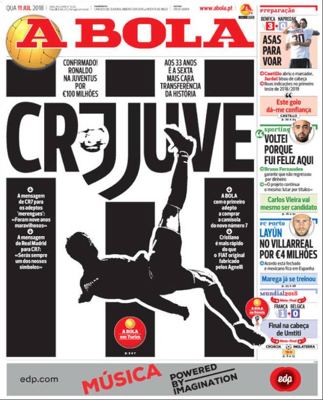 In Spagna, invece, la notizia del trasferimento ufficiale di Cristiano Ronaldo dal Real Madrid alla Juventus ha destato parecchio scalpore. Sport parla di "Shock Cristiano", mentre As saluta il Pallone d’Oro in carica: "Ciao, Cristiano. E’ stato bello finché è durato". "CR Sette", scritto in italiano, è invece l’apertura di Mundo Deportivo. Infine prima pagina dedicata al trasferimento del secolo anche in Portogallo, il Paese del nuovo calciatore bianconero: "CR7 Juve", questo il titolo principale di A Bola.