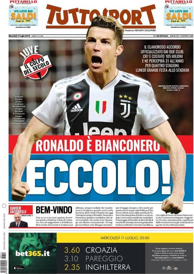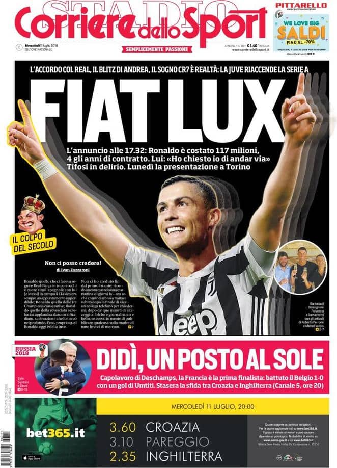 Entusiasmo nelle prime pagine dei principali quotidiani sportivi italiani. "Arrivo!", il titolo principale de La Gazzetta dello Sport, che apre con una foto della classica esultanza di Cristiano Ronaldo. "Fiat Lux", l’apertura del Corriere dello Sport, che 'gioca' su un fotomontaggio di CR7 già vestito di bianconero. "Eccolo" è invece il titolo di Tuttosport, che esalta l’arrivo del campione portoghese ormai ex Real Madrid alla Juventus.
