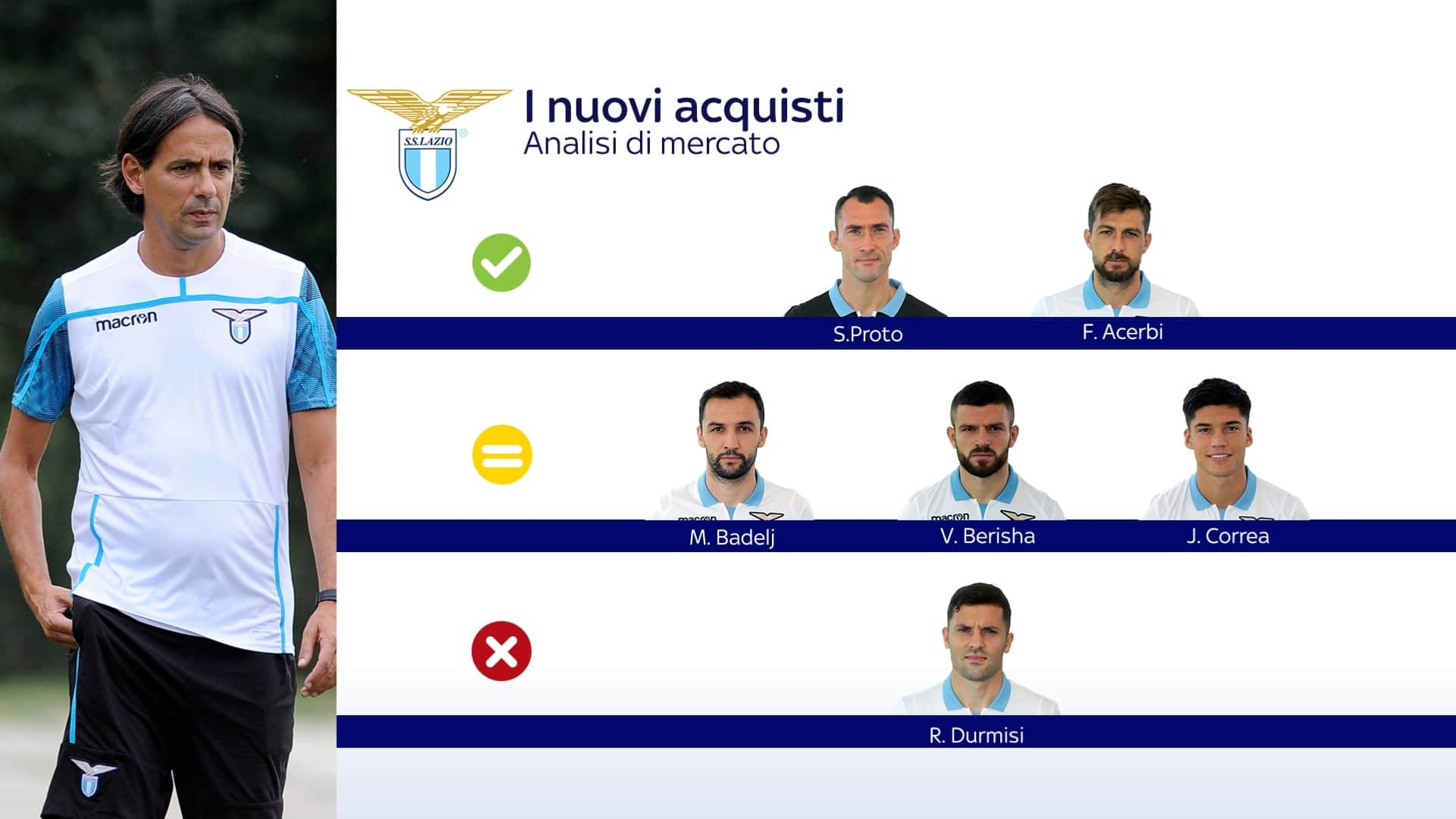 Nonostante un’ultima settimana difficile, la Lazio ha dimostrato di saper usare al meglio gli acquisti dell’estate per far fronte alle necessità della rosa. E allora ecco che il semaforo verde è tutto per Francesco Acerbi, unico vero nuovo chiamato a sostituire un titolare della scorsa stagione, ovvero De Vrij. L’ex Sassuolo le ha giocate tutte ed è come al solito una garanzia: già leader, può far sorridere Simone Inzaghi. Pollice in su anche per Silvio Proto, portiere di Europa League della Lazio: la sua esperienza è anche stimolo per Strakosha e si sta comportando bene. Semaforo giallo invece per Milan Badelj: è arrivato per permettere il turnover a centrocampo con Lucas Leiva: quando chiamato in causa si è comportato bene, ma da lui la Lazio si aspetta di più. Così come da Valon Berisha, anche ancora deve entrare nei meccanismi di Inzaghi: arrivato a Roma con un ottimo curriculum, ha trovato finora spazio in soli due piccoli spezzoni di gara. A corrente alternata infine Joaquin Correa, l'acquisto più costoso dell'estate biancoceleste: essere jolly di una squadra non è facile, ma l’argentino può sicuramente crescere. Semaforo rosso, infine, per Riza Durmisi: ha giocato poco, comunque il suo avvio di stagione non è stato positivo. Ha bisogno di crescere.