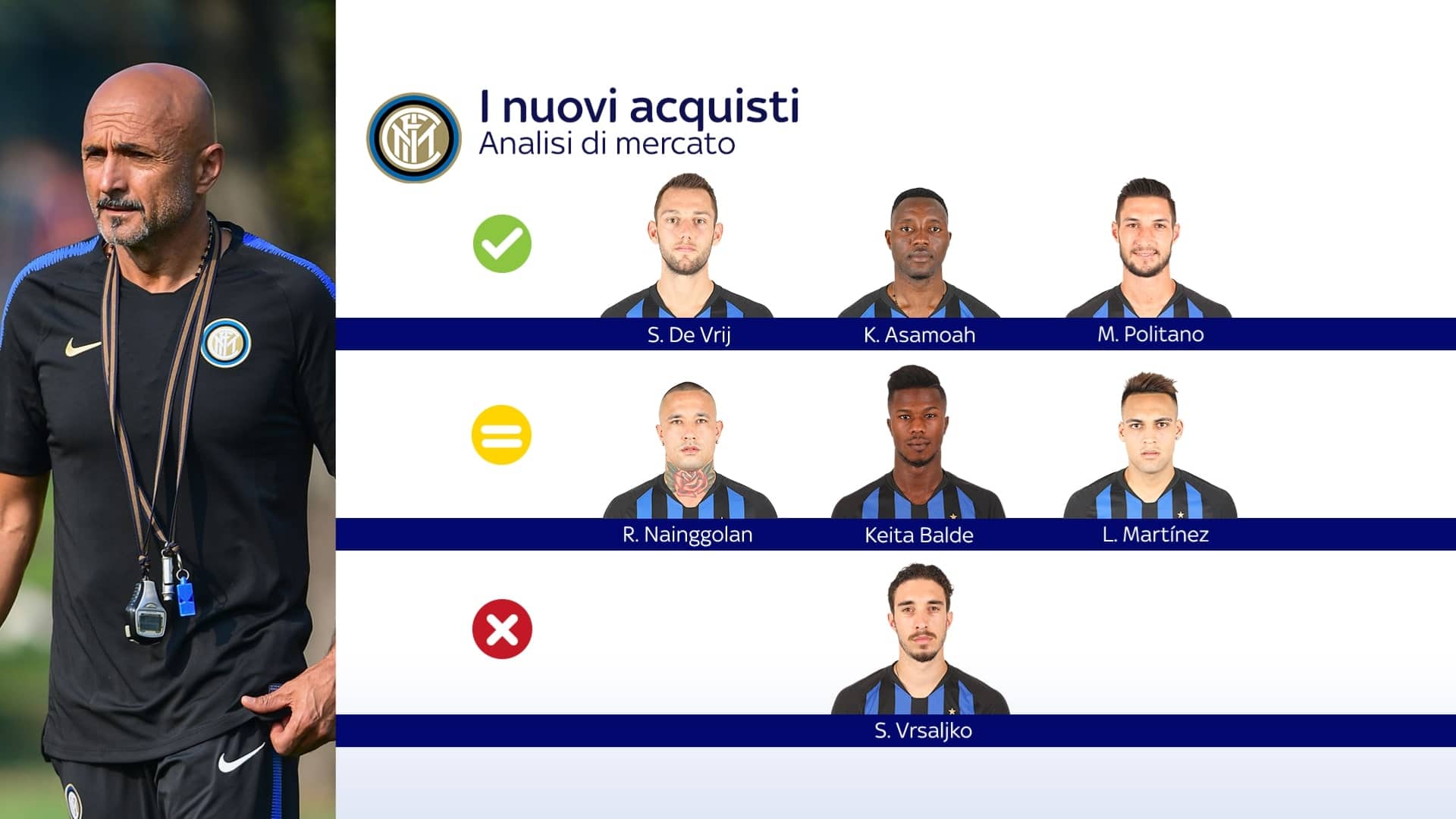 L’Inter è stata tra le squadre che meglio hanno agito sul mercato in estate e i risultati della campagna acquisti si sono visti sul campo. Motivo, questo, per cui solo un nuovo giocatore nerazzurro merita il semaforo rosso: si tratta di Sime Vrsaljko, che in campionato ha giocato solo 167’ ed è stato fermato da un problema al ginocchio. Rientrato nel match contro la Spal, ha però subito fornito l’assist per il primo gol. A meritare il semaforo verde è invece Stefan De Vrij: l’ex Lazio ha subito trovato posto al fianco di Skriniar e i due sono già una coppia solida e affiatata. Promosso anche un altro parametro zero, ovvero Kwadwo Asamoah: l’Inter da tempo cercava certezze a sinistra e l’ex Juve si è subito imposto. Garanzia. Ottimo, infine, anche l’impatto di Matteo Politano: fiducia immediata da parte di Spalletti e risposta sul campo con prestazioni di carattere e sacrificio. Semaforo giallo per tre giocatori. Il primo è Radja Nainggolan: non promosso appieno non tanto per le sue prestazioni, quanto perchè potrebbe dare - come ricordato spesso dal suo allenatore - ancora di più ai suoi. Discorso diverso per Keita Balde, che in nerazzurro è ancora a caccia della sua vera identità: non ha ancora inciso ma non gli è neppure stato dato tanto spazio per farlo. Stessa situazione che sta vivendo Lautaro Martinez: ha dimostrato di valere da prima prima punta, ma la presenza di Mauro Icardi è molto ingombrante.