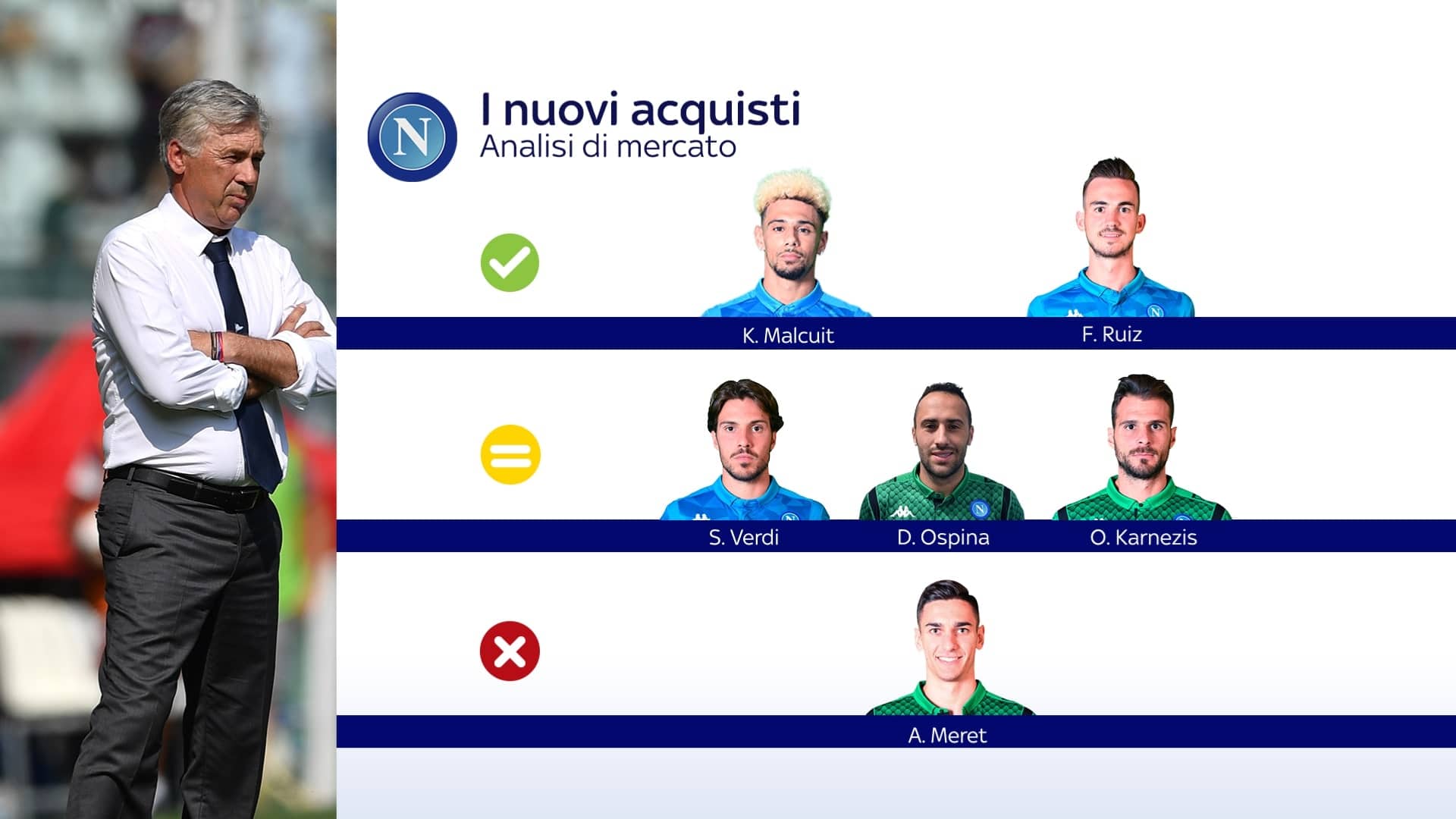 Nonostante la Juventus sia già in procinto di fuggire in classifica, il Napoli può sorridere dopo questo inizio di stagione. La squadra c’è e risponde ai dettami di Carlo Ancelotti, dopo un triennio intenso con Maurizio Sarri. L’ex allenatore del Psg può sicuramente essere felice dei nuovi acquisti, che hanno permesso alla rosa di essere più lunga e rinforzata. Bene soprattutto Fabian Ruiz, quello tra i nuovi che ha finora avuto più spazio: il centrocampista spagnolo può ricoprire più ruoli e si è inserito stabilmente nelle rotazioni di Ancelotti. Per lui semaforo verde, così come per Kevin Malcuit, lanciato da titolare in due delle ultime tre sfide di Serie A. Il francese a destra ha dimostrato di saperci stare e ha mostrato doti che nel corso della stagione potranno sicuramente fare comodo al Napoli. Semaforo giallo invece per due dei tre nuovi portieri azzurri: David Ospina e Orestis Karnezis: i due si sono dati il cambio in questo avvio di stagione, con il colombiano che sembra ora essersi attestato al vertice delle gerarchie. In attesa di Alex Meret, unico semaforo rosso del mercato del Napoli: l’ex Spal, dopo la frattura dell’ulna, sta completando il suo rientro e punta a diventare titolare della squadra.