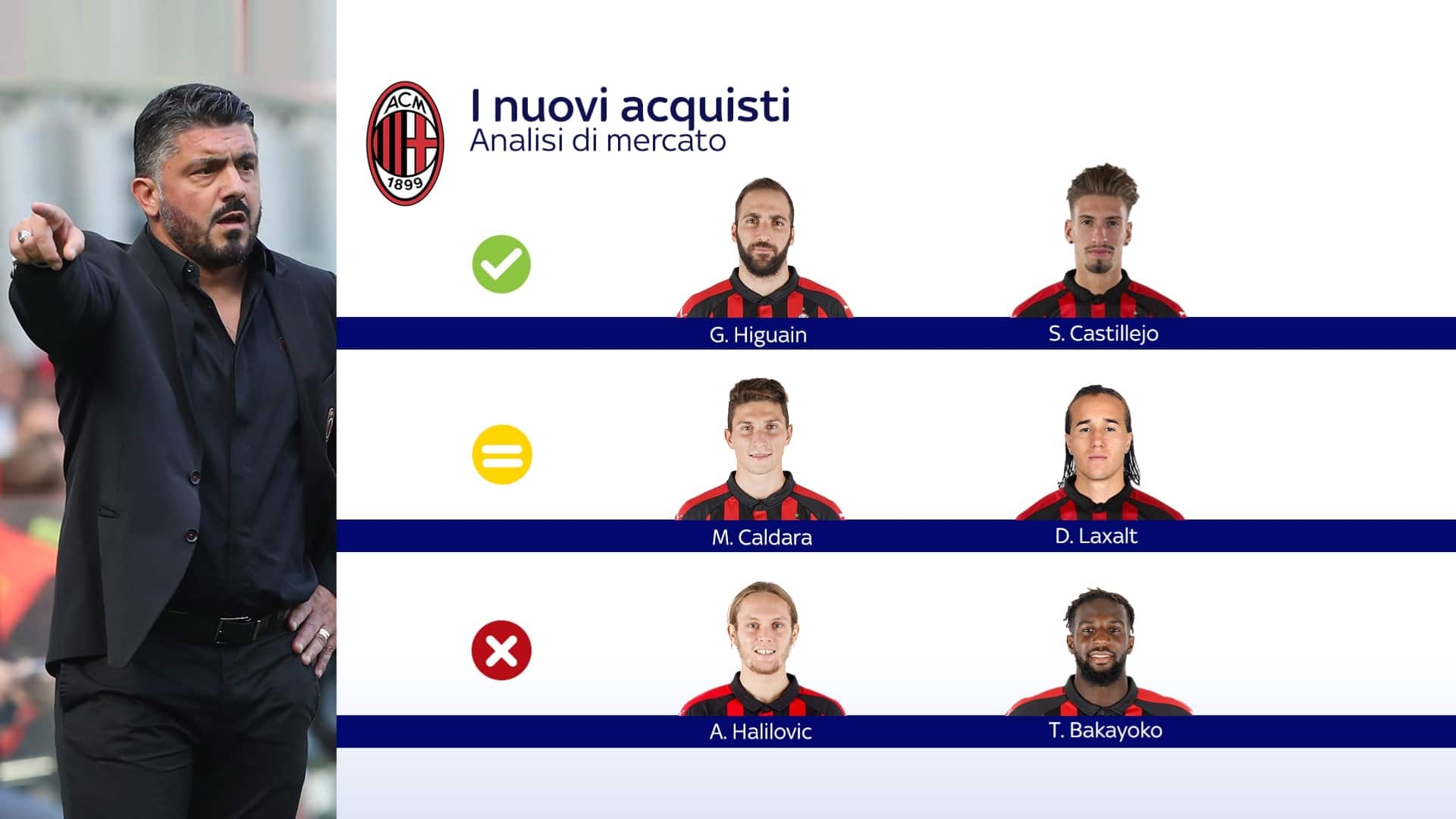 Dopo il mercato estivo c’era curiosità intorno al rendimento dei nuovi giocatori del Milan. La società ha puntato su profili diversi tra loro, cercando di colmare le necessità della rosa di Gattuso in vista anche di una stagione con competizioni lunghe e logoranti. La garanzia da semaforo verde è, su tutte, Gonzalo Higuain: l’argentino è tornato a segnare con grande continuità e si sta prendendo il ruolo di trascinatore della squadra. Da quando ha iniziato a segnare non si è più fermato. Bene, con lui, anche Samu Castillejo: arrivato da Villarreal, l’esterno si sta comportando bene nel ruolo di ricambio a partita in corso. Corsa, tecnica, giocate: pollice in su per lui. Semaforo giallo invece per Mattia Caldara e Diego Laxalt: il primo, fermato dalla pubalgia, deve ancora incidere sul rendimento della difesa rossonera; il secondo, invece, resta per ora un jolly sulla sinistra, dove ha agito sia da terzino che da ala. Potrà sicuramente tornare utile a stagione in corso. Semaforo rosso infine per altri due nuovi, Alen Halilovic e Timoue Bakayoko. Il primo non si è mai visto in campo in questo inizio di stagione e resta un grande punto interrogativo. Il secondo ha invece avuto un impatto non positivo nel ruolo di mezzala.
