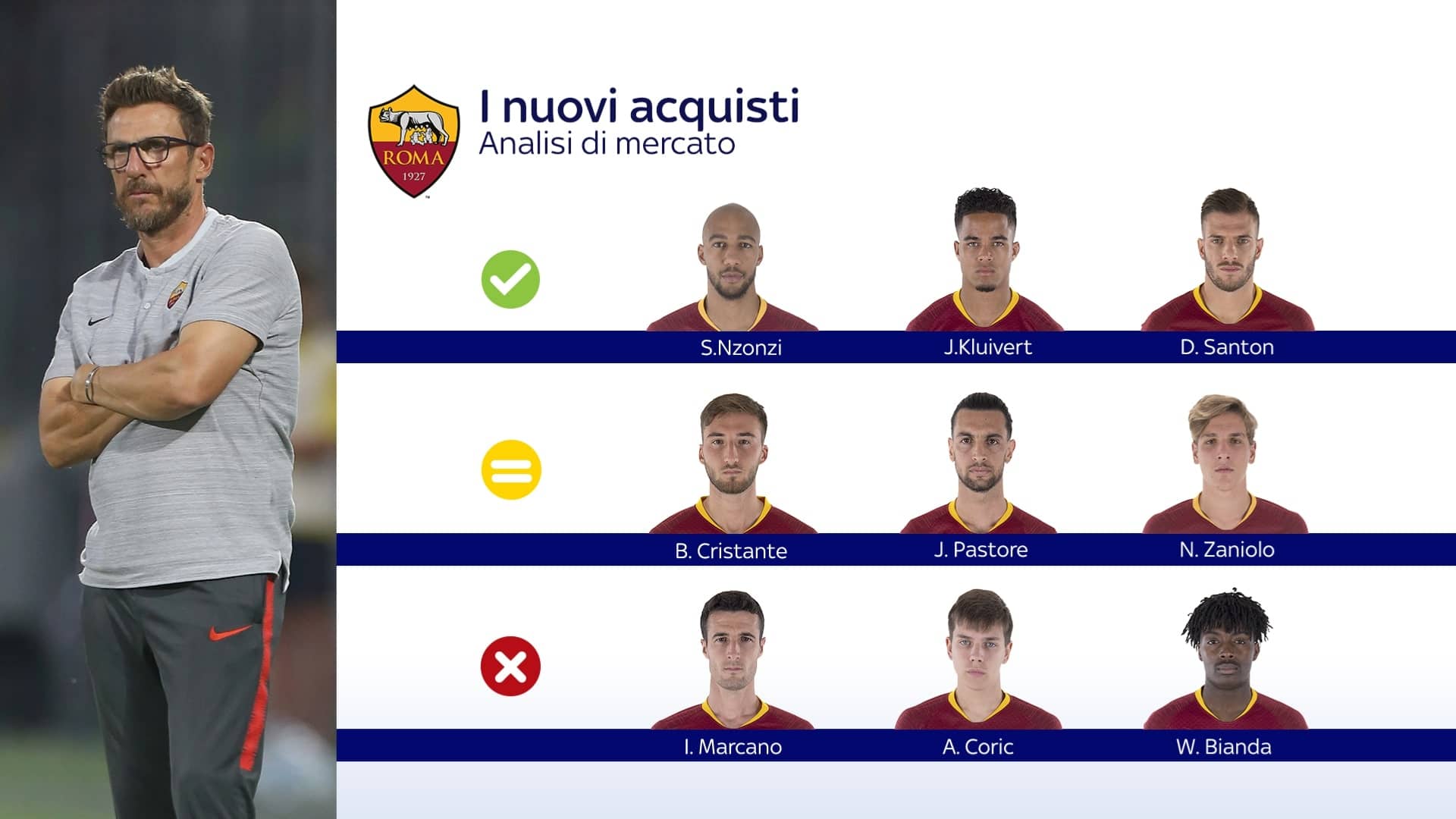 La rivoluzione della Roma sta pian piano dando i suoi frutti. Dopo un difficile avvio di stagione, i giallorossi hanno inanellato una serie di quattro vittorie consecutive tra campionato e Champions, derby compreso. Risultati che ora rilanciano la squadra di Di Francesco, in netta risalita grazie anche alle prestazioni dei giocatori arrivati in estate. Chi ha colpito nelle ultime uscite è Steven N’Zonzi, che entrato nel meccanismi della squadra e sta facendo bene nel ruolo di mediano al fianco di Daniele De Rossi. Semaforo verde per il campione del mondo, così come per Davide Santon: l’ex Inter si sta riaffermando e Di Francesco gli sta concedendo lo spazio per mostrare le sue qualità. Bene, infine, anche Justin Kluivert, giovanissimo che sta meritando di essere tra i promossi del mercato giallorosso. Meno bene rispetto a loro (semaforo giallo) il grande colpo dell’estate: Javier Pastore. L’argentino, nonostante le due meraviglie di tacco, è apparso ancora indietro nella condizione e non ha fatto ancora la differenza che ci si poteva aspettare. Stesso discorso può valere per Bryan Cristante: il cambio di modulo di Di Francesco e l’exploit di Pellegrini lo hanno costretto a rimanere in seconda fila. Giudizio rimandato infine per Nicolò Zaniolo, classe 1999 che ancora deve dimostrare in campo quanto di buono si dice sul suo conto. Semaforo rosso, infine, per Ivan Marcano, Ante Coric e William Bianda: se il primo è stato impiegato da Di Francesco in tre occasioni, senza però mettersi molto in evidenza, gli altri due restano oggetti del mistero.