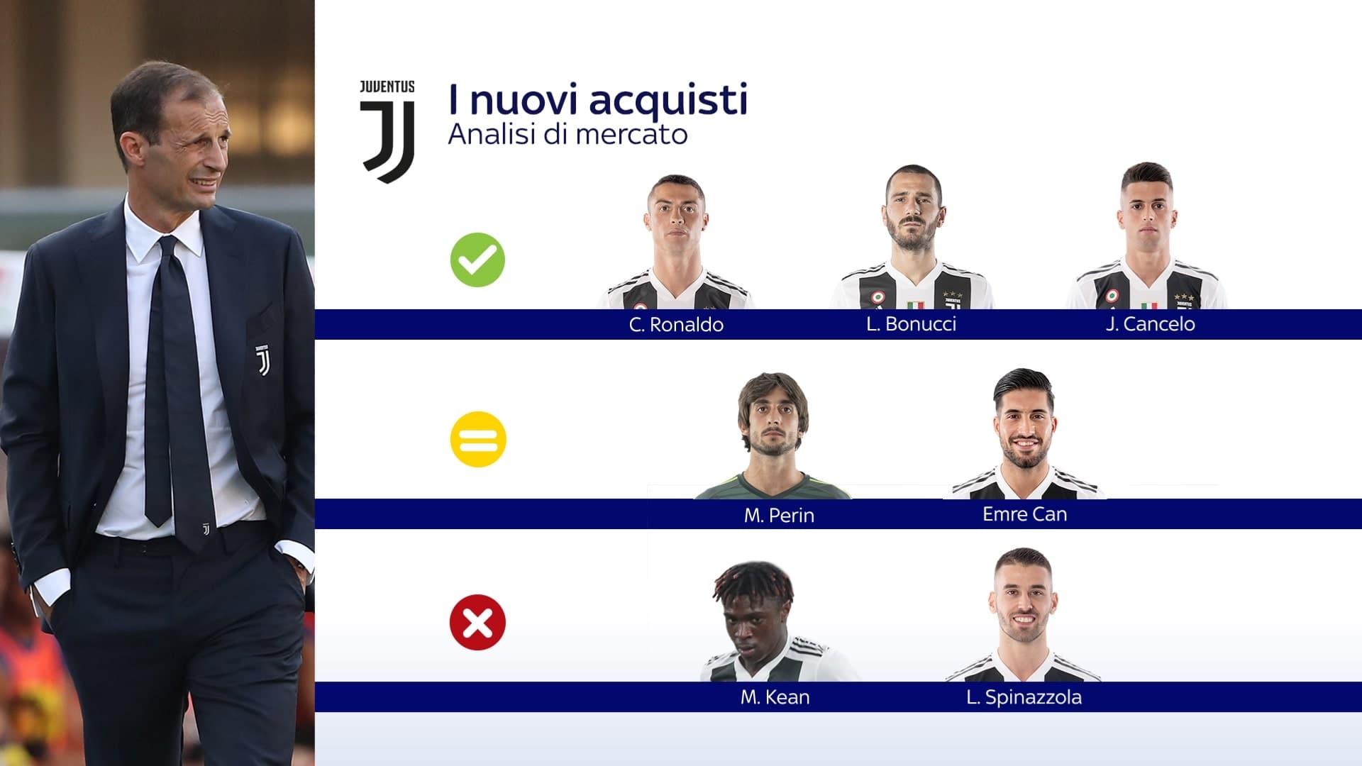 Dopo un calciomercato estivo spaziale, la Juventus sta confermando la sua incredibile forza in campionato e in Champions. La squadra di Allegri le ha vinte tutte in questo inizio di stagione, anche grazie ai nuovi arrivati in estate. Tra questi la stella più luminosa è certamente quella di Cristiano Ronaldo, il più atteso che ha già dimostrato di saper fare la differenza: 4 gol e 4 assist nelle prime otto di Serie A della sua carriera, quanto basta per dargli semaforo verde, pur consapevoli che i suoi numeri possono ancora crescere. Promosso con lui anche Leonardo Bonucci che, dopo una parentesi agrodolce al Milan e un ritorno molto discusso in bianconero, ha dimostrato di essere ancora un grande leader, sia tecnico che carismatico. Fischi di inizio stagione dimenticati: sta ritrovando le sue vecchie certezze. Chi ha impressionato di più è Joao Cancelo, che già all’Inter aveva dimostrato di avere grandi doti. Il portoghese si è preso subito il posto e la scena, affermandosi come uno dei terzini destri migliori d’Europa. È tra i più presenti con Allegri: il suo impatto in casa Juve è stato molto positivo. Semaforo giallo invece per Emre Can, che ha palesato qualche difficoltà nella prima parte di stagione. Reduce da un lungo stop, deve ancora inserirsi appieno nei metodi del suo allenatore. Avrà bisogno di tempo, ma le sua qualità non si discutono. Con il tedesco anche Mattia Perin: quando è stato chiamato in causa ha fatto molto bene, ma il fatto di essere il secondo di Szczesny ha chiaramente ridimensionato le sue possibilità di mettersi in mostra. Semaforo rosso infine per due giocatori che, per motivi diversi, devono ancora dimostrare il loro valore sul campo. Il primo è il giovanissimo Moise Kean: con tutta la concorrenza che ha in attacco, il talento dell’U21 non è riuscito finora a trovare grande spazio. Il secondo è invece Leonardo Spinazzola, fermo per colpa dell’infortunio e per questo ancora da valutare.