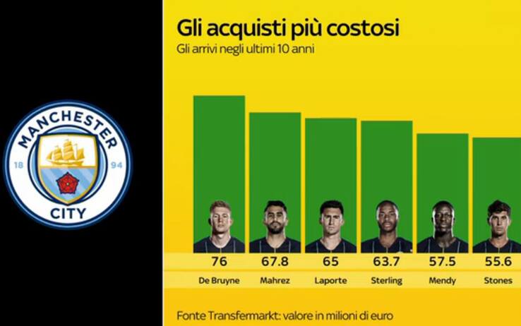 Campioni d'Inghilterra in carica e pretendenti alla Champions League, i Citizens di Guardiola vantano una rosa stellare costruita attraverso operazioni dai prezzi vertiginosi. Analizzando i valori condivisi da Transfermarkt, i 6 arrivi più onerosi dell'ultimo decennio superano a testa il tetto dei 55 milioni di euro