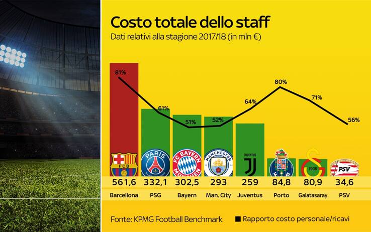 Sempre più marchi globali ma con le caratteristiche tipiche dei club di calcio. Il Barcellona è il club che spende più di tutti per il proprio parco giocatori e staff, con un costo pari a 561,6 milioni di euro. Secondo il PSG con 332, quinta la Juventus con 256 milioni di euro. Un’incidenza sui ricavi totali che per tutti i club d’Europa è oltre il 50%: si passa dal 51% del Bayern Monaco fino all’81% del Barcellona, che nell’ultimo anno ha visto aumentare il costo del personale del 42%. Pur con una campagna acquisti importante nella finestra di mercato 2017/2018, il costo totale del personale in casa Juventus è rimasto stabile con un rapporto del 64%. Se è vero che l’aumento dei ricavi degli abbonamenti dell’Allianz Stadium per la stagione 2018/2019 è stata del 20%, va anche detto che lo stipendio di Cristiano Ronaldo inciderà per circa 60 milioni di euro, aumentando del 25% i costi del personale e facendo innalzare il rapporto con i ricavi totali tra il 70 e l’80%.