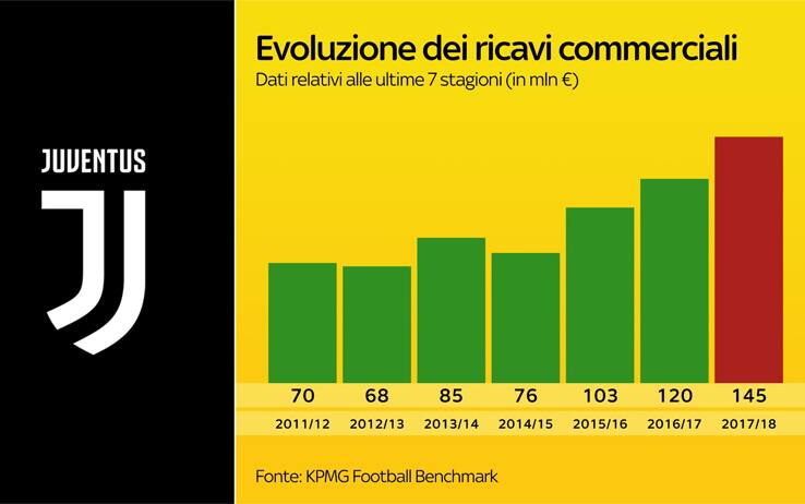 In campo come fuori, la Juventus lavora per migliorare ogni aspetto e rimanere al passo dei top club d’Europa. Un lavoro di programmazione partito da lontano e culminato, per la parte sportiva, nell’acquisto del cartellino di Cristiano Ronaldo, di cui abbiamo parlato a lungo e che sarà sicuramente una spinta ulteriore per migliorare ancora gli affari commerciali bianconeri. L’obiettivo Champions League non è un mistero, ma la continuità di vittorie in Italia, insieme ad un cammino in costante crescita in Europa ha portato ad un aumento anno dopo anno dei ricavi commerciali. La Juventus è passata dai 70 milioni del 2011/12 ai 145 milioni dell’ultima stagione, dato in crescita del 21% rispetto alla stagione precedente. Due i fattori principali: sponsorizzazioni e pubblicità (+16%), merchandising e licensing (+45%). Dati, come detto, destinati a crescere ulteriormente.