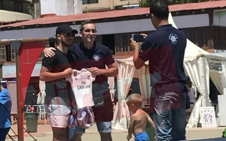 Eden Hazard è stato fotografato per la prima volta con quella che potrebbe essere la sua nuova maglia, a partire dalla prossima stagione. Il talento belga, infatti, è stato immortalato a Marbella, città dell'Andalusia nota per la bellezza delle sue spiagge, mentre tiene in mano una mini maglia del Real Madrid e si fa fotografare con alcuni camerieri. La foto è stata pubblicata in esclusiva dalla redazione online del Mirror, entrata in possesso dello scatto che rappresenta l'ennesimo indizio di una trattativa già ben indirizzata verso la conclusione. Peraltro, riporta sempre il Mirror, Hazard ha autografato la maglia che gli è stata porta da un cameriere tifosissimo del Barcellona che gli avrebbe proposto di passare ai blaugrana, con il belga che ha gentilmente negato l'invito toccandosi il petto e lasciando intendere il prossimo passaggio agli storici rivali dei catalani.