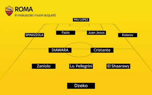 ACQUISTI: Diawara (c, Napoli); Spinazzola (d, Juventus), Pau Lopez (p, Betis Siviglia). CESSIONI: Manolas (c, Napoli); Ponce (a, Spartak Mosca); Lu. Pellegrini (d, Juventus)