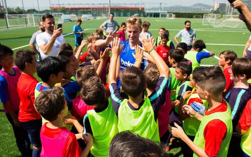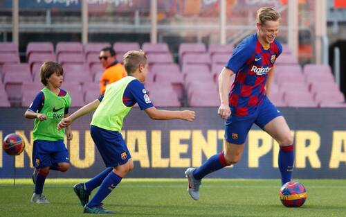 Terminate le visite mediche, de Jong ha ricevuto l'abbraccio dei giovanissimi giocatori della cantera blaugrana, poi sfidati simpaticamente sul campo (fonte foto Twitter @FCBarcellona)