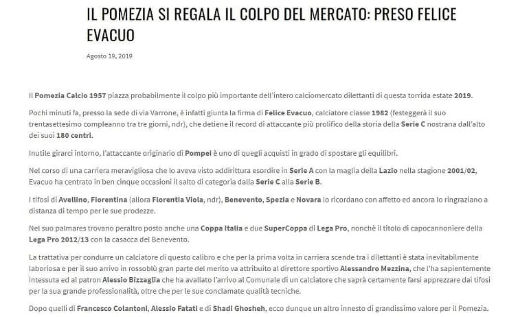L'entusiasmo per l'arrivo di un centravanti di razza può giocare anche brutti scherzi. È successo a Pomezia, dove il club che giocherà il prossimo campionato di Serie D nel girone E ha annunciato l'arrivo di Felice Evacuo, centravanti classe 1982 cresciuto nel settore giovanile della Lazio e autore di 216 reti in carriera tra i professionisti, nell'ultima stagione tra i protagonisti della promozione del Trapani in Serie B. A firmare per il club laziale, però, era stato un altro Evacuo: Davide, fratello minore dalla carriera meno luminosa.
