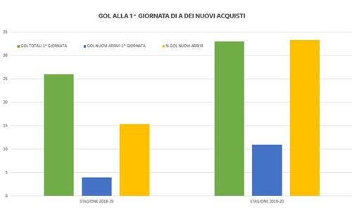 Un terzo delle reti del primo weekend di campionato porta la firma di colpi arrivati dal mercato, un'incidenza doppia rispetto all'inizio della passata stagione - 4 gol su 26 totali nel 2018/19. E questo nonostante molti dei nuovi acquisti non hanno giocato (o sono scesi in campo soltanto qualche minuto), mentre chi ha avuto una chance l'ha sfruttata come meglio non avrebbe potuto