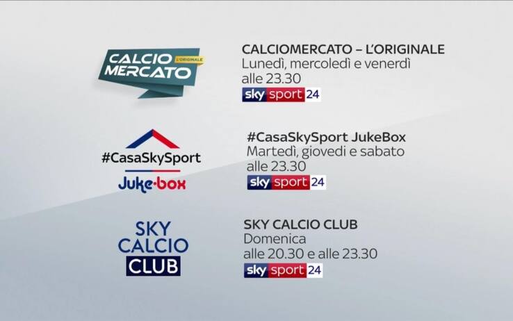 E dal 6 aprile ritorna su Sky Sport 24 anche Calciomercato – L'Originale, che andrà in onda tutti i lunedì, mercoledì e venerdì alle ore 23.30. Sarà una trasmissione particolare, con Alessandro Bonan e Gianluca Di Marzio pronti a tenervi compagnia intervenendo da casa, con tante storie da raccontare e molti ospiti e, ovviamente, con le notizie di mercato che ci saranno in queste settimane. Il martedì, il giovedì e il sabato, sempre alle 23.30, andrà in onda Casa Sky Sport JukeBox, mentre la domenica sera torna Sky Calcio Club alle 20.30 e alle 23.30. E come le altre settimane da non perdere lunedì, mercoledì e venerdì alle 20:15 Sky Sport Room.