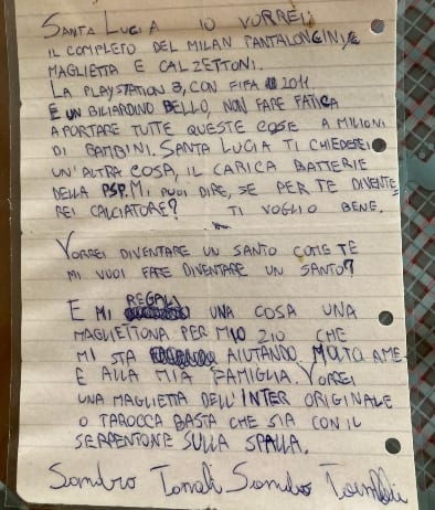 E poi c’è la famosa (per chi già conosce la sua storia) letterina a Santa Lucia conservata “plastificata” da nonna Biagina, altro personaggio già noto ai tifosi di Sandro, alla quale il ragazzo è legatissimo. In questa letterina chiede un completo rossonero per sé e una “magliettona originale o al limite anche tarocca” per lo zio interista. Nonna Biagina non si perde una partita ed è la curatrice di un vero e proprio museo casalingo dedicato al nipote, che negli anni le ha regalato tutte le maglie delle sue “prime volte”.