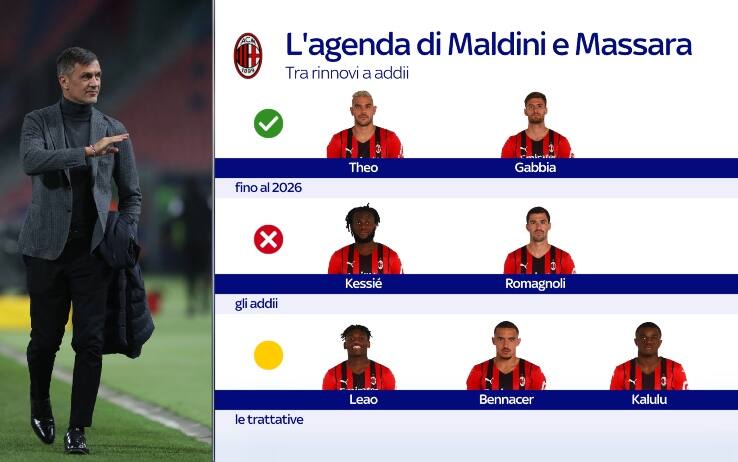 Il primo obiettivo della società è quella di tenere i giocatori migliori in prospettiva futura. Sono già stati ufficializzati i rinnovi di Theo Hernandez e Matteo Gabbia, entrambi fino al 2026. La stessa scadenza è prevista anche per i nuovi contratti di Bennacer, Leao e Kalulu. Sono loro i prossimi giocatori che rinnoveranno, con un adeguamento di contratto. Questa è la base del nuovo Milan che perderà a parametro zero pezzi importanti come Kessié, che ha già firmato con il Barcellona, e probabilmente Romagnoli, anche lui in scadenza di contratto e in trattativa con la Lazio. Per rimpiazzarli, il Milan sta valutando giocatori dal valore assicurato. Tra questi ci sono Renato Sanchez e Sven Botman del Lille. Con i francesi c'è un canale di mercato privilegiato viste le operazioni già concluse in passato (Leao e Maignan in Italia, Tiago Djalò in Francia).
