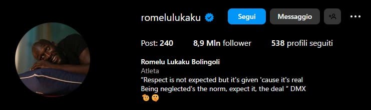 Nuovo "messaggio social" da parte di Romelu Lukaku. L'attaccante belga, che nei giorni scorsi aveva pubblicato una frase enigmatica nella storie Instagram ("quando l'odio non funziona, si iniziano a dire bugie"), ha cambiato la sua biografia su con un'altra frase enigmatica. "Il rispetto non è previsto ma è dato, perché è reale. Essere trascurati è la norma, aspettalo, l'accordo". Un passaggio estratto dal brano "How's it Goin' Down" del rapper americano DMX che può avere una chiave di lettura in chiave mercato, con un futuro ancora da scrivere per Lukaku.