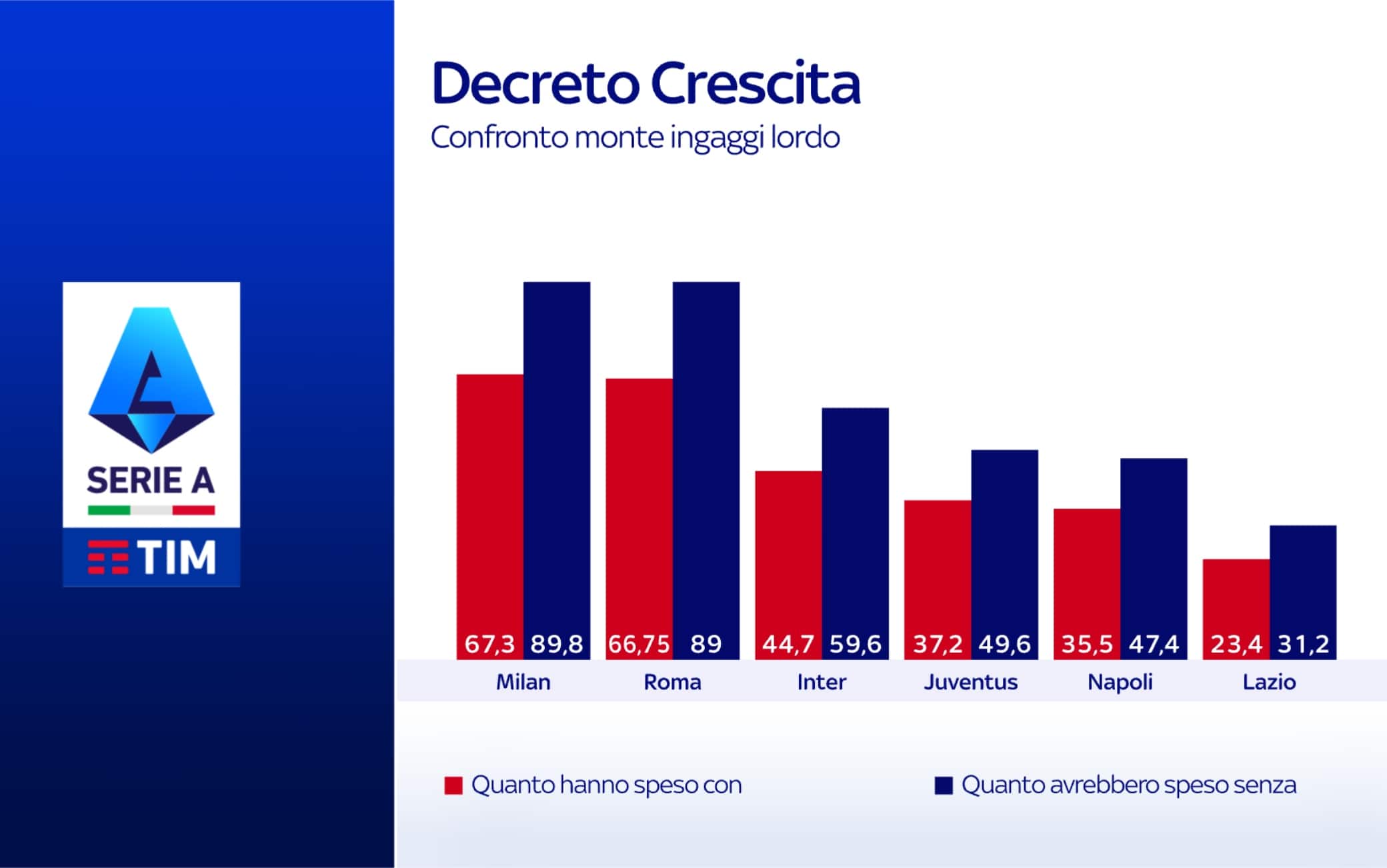 Nella scorsa finestra di mercato, tanto per dare un’ordine di grandezza, praticamente la metà delle operazioni fatte in Serie A (esclusi gli obblighi di riscatto) sono state fatte utilizzando il decreto crescita. 64 su 129. Il risparmio finora ottenuto dalle società di Serie A in questa stagione, finora, è stato di quasi 140 milioni di euro. Una cifra che da febbraio in poi non sarà più risparmiata dai club. Che dovranno pensare a fare operazioni ragionando con la stessa aliquota di tasse. I soldi che finora erano stati risparmiati dai club hanno portato a una maggiore competitività, come detto. Non erano legati a nessun tipo di sviluppo infrastrutturale (campi di allenamento, centri sportivi, stadi) ma alla possibilità di arrivare a giocatori più forti spendendo cifre inferiori rispetto agli altri. Senza decreto crescita, la Serie A, per mantenere (a livello teorico) lo stesso tasso tecnico, avrebbe dovuto spendere 140 milioni di euro in più. Non li spenderà perché la norma non può essere retroattiva, ma è giusto per dare una grandezza a questo strumento.