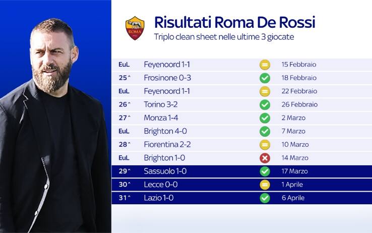 Si aspetta solo il rinnovo per De Rossi. Non si intravede un solo motivo per non iniziare a pensare di programmare il futuro insieme a lui. L'interpretazione del derby è l’ultimo segnale di un lavoro finora eccellente: una squadra solida e ottimamente organizzata, capace di creare il giusto a rischio zero. Neanche un’occasione lasciata alla Lazio, in una partita caratterizzata anche da comportamenti giusti. Novanta minuti con carattere e intensità, da derby, evitando di cadere in atteggiamenti isterici, controproducenti.