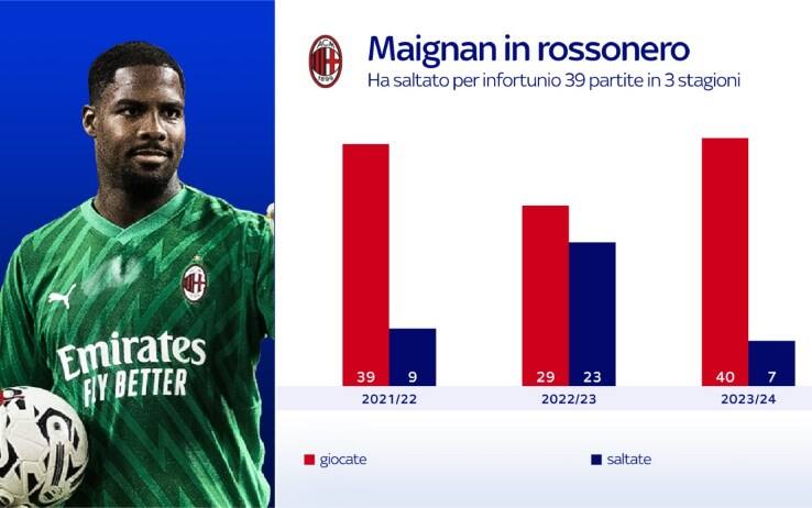 L'ultimo infortunio di Maignan, che salterà la partita contro il Genoa e verrà rivalutato la prossima settimana, riapre la discussione sul tema portiere in casa rossonera. Il francese ha un contratto che scadrà nel 2026 ma al momento non ci sono avanzamenti sulla trattativa per rinnovo di contratto. Il Milan prende tempo e valuta. Non solo per le partite giocate in questa stagione da Mike, non proprio "Magic" come lo chiamano i tifosi, ma piuttosto normali. Soprattutto per i diversi infortuni che l'hanno tenuto spesso fuori causa, anche nell'ultima contro la Juve, quella in cui Sportiello è stato non solo degno sostituto ma addirittura migliore in campo. Nelle tre stagioni al Milan, Maignan ha saltato 39 partite su 147 totali. Probabilmente troppe. Ecco perché se dovesse arrivare una grande offerta, il Milan la prenderebbe in seria considerazione.