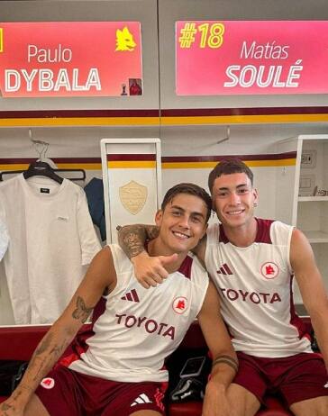 Il primo 'annuncio' social era arrivato già nella giornata di lunedì con una foto sui propri social che ritraeva uno spazio vuoto in spogliatoio accanto a sé e Leandro Paredes (gli altri argentini presenti in rosa). Ma Paulo Dybala non si è fermato, e 24 ore più tardi di fatto anticipa l'ufficialità di Soulé alla Roma ancora prima che sia il club ad annunciare l'arrivo dell'argentino. Nuova foto sul proprio profilo Instagram, questa volta con lo stesso Soulé protagonista: "Benvenuto fratello", e rigorosamente posto in spogliatoio accanto a lui.