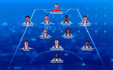 JUVENTUS (4-2-3-1): Di Gregorio; McKennie, Gatti, Kalulu, Cambiaso; Locatelli, Thuram; Yildiz, Koopmeiners, Mbangula; Kolo Muani. All. Motta
