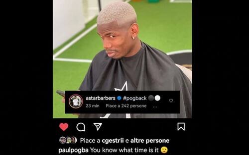 - E' addirittura il 26 maggio quando il giocatore del Manchester United inizia a seminare i primi indizi su un suo ritorno in bianconero. A fornire il primo è niente meno che il suo barbiere, al termine di un botta e risposta social in cui Pogba, fresco di taglio e con i capelli ossigenati quasi bianchi dice ammiccando "Sai di cosa è ora" e il barbiere risponde "Pogback" con due cerchiolini bianconeri. Commento poi rimosso, ma ormai i social erano già impazziti