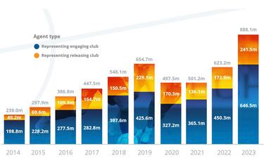 - L’annuale "Report sugli agenti calcistici nei trasferimenti internazionali" pubblicato dalla Fifa conferma quella che è la tendenza degli ultimi anni: i club spendono sempre di più in commissioni per i procuratori, con il totale del 2023 che ha superato gli 814 milioni di euro.