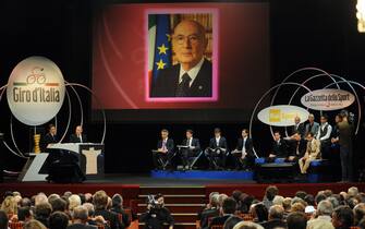 I ciclisti presenti alla presentazione del Giro: Cunego, Visconti, Scarponi, Ballan, Garzelli, Nibali e Petacchi (foto Ansa)