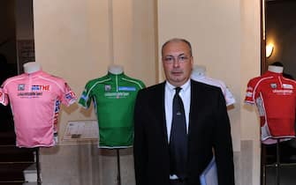 Il patron del Giro d'Italia, Angelo Zomegnan, con le maglie delle classifiche del Giro (foto Ansa)