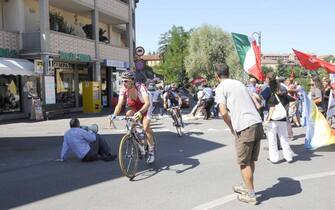 I ciclisti corrono tra ali di manifestanti, qualcuno cerca di bloccare il percorso