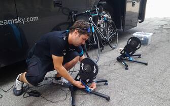 Partiamo dalla fine: dopo 200km (metro più, metro meno) di corsa, poco prima che i corridori taglino il traguardo, Marko prepara i rulli per i ragazzi del Team Sky che di lì a poco raggiungeranno il bus -