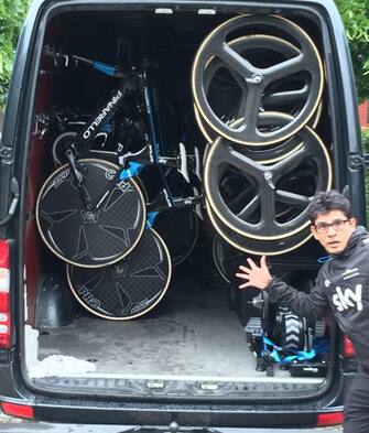 Con una ventina di grandi giri alle spalle, Rajan ormai è espertissimo nel sistemare bici e ruote all'interno del van che riporterà parte dei materiali all'hotel -