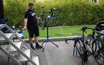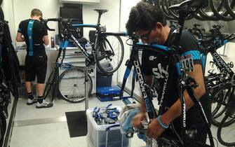 Una volta arrivati a destinazione, i meccanici si mettono al lavoro sulle bici, pulendole e controllando che nulla sia stato danneggiato durante la corsa -