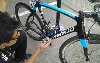 Un ultimo controllo al sistema gps e alle bici prima del ritrovo di partenza -