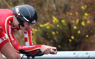 Anche la prova delle ragazze è stata “battezzata” dalla pioggia, che si vede chiaramente sul casco della seconda classificata, Pernille Mathiesen. Quinta ai recenti europei, la danese si è confermata un talento delle cronometro