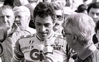 Francesco Moser circondato dai giornalisti sul velodromo di Città del Messico -