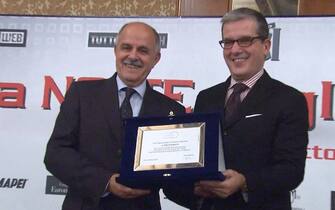 Il diesse della Feralpi Monteclarense, Tiziano Gozio, riceve il suo premio da Gilbertto Simoni.