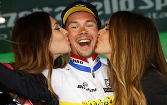 Un bacio, un sorriso e magari un buon bicchiere di vino per Primoz Roglic, per festeggiare il successo nella crono Radda in Chianti-Greve in Chianti -