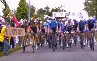 La spettatrice con il cartello, che sabato scorso ha provocato la maxi-caduta e il ferimento di un impressionante gruppo di ciclisti in gara al Tour de France, è stata identificata e posta in stato di fermo dalla polizia transalpina, secondo quanto si apprende da fonti dell'inchiesta. La donna, una francese, nel corso della prima tappa Brest-Landerneau aveva innalzato appunto un grande cartello, sporgendosi un po' troppo sulla strada e colpendo Tony Martin: la conseguente caduta del tedesco ha creato un inevitabile "effetto-domino" e a terra sono finiti tanti corridori, tra cui l'italiano Sonny Colbrelli, il belga Wout van Aert, il colombiano Miguel Angel Lopez e Jasha Sütterlin, costretto al ritiro. "Allez Opi-Omi!" la scritta sul cartellone, una dedica in "franco-tedesco" ai nonni, che è costata alla tifosa la denuncia della direzione organizzativa della Grande Boucle per "lesioni involontarie e deliberata violazione degli obblighi di sicurezza e di prudenza".