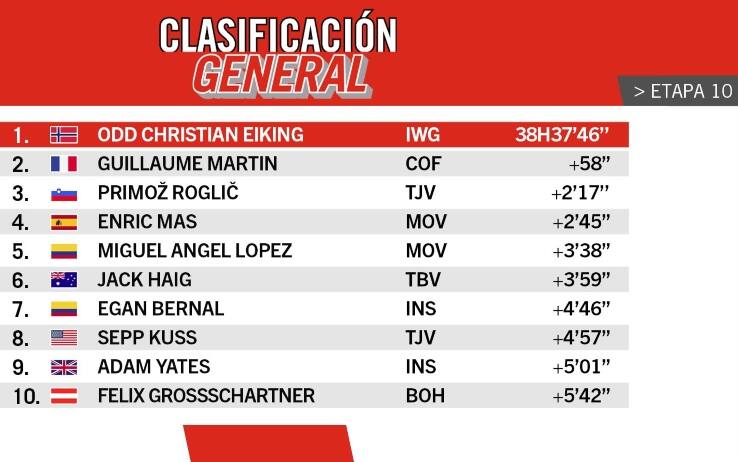 Il protagonista di giornata è proprio Roglic, che attacca sul Puerto de Almachar, 10,9 km al 5%, staccando i rivali. Lo sloveno sbaglia poi una curva a destra in discesa e cade, facendosi riprendere da Mas. Nonostante questo contrattempo, il corridore della Jumbo-Visma guardagna comunque 37 secondi su Egan Bernal. Con il colombiano, vincitore dell'ultimo Giro d'Italia, arriva anche un buon Fabio Aru. Domani, mercoledì 25 agosto, è in programma l'11^ tappa, 133.6 chilometri da Antequera a Valdepenas de Jaen, altra frazione con diversi Gran Premi della montagna.
